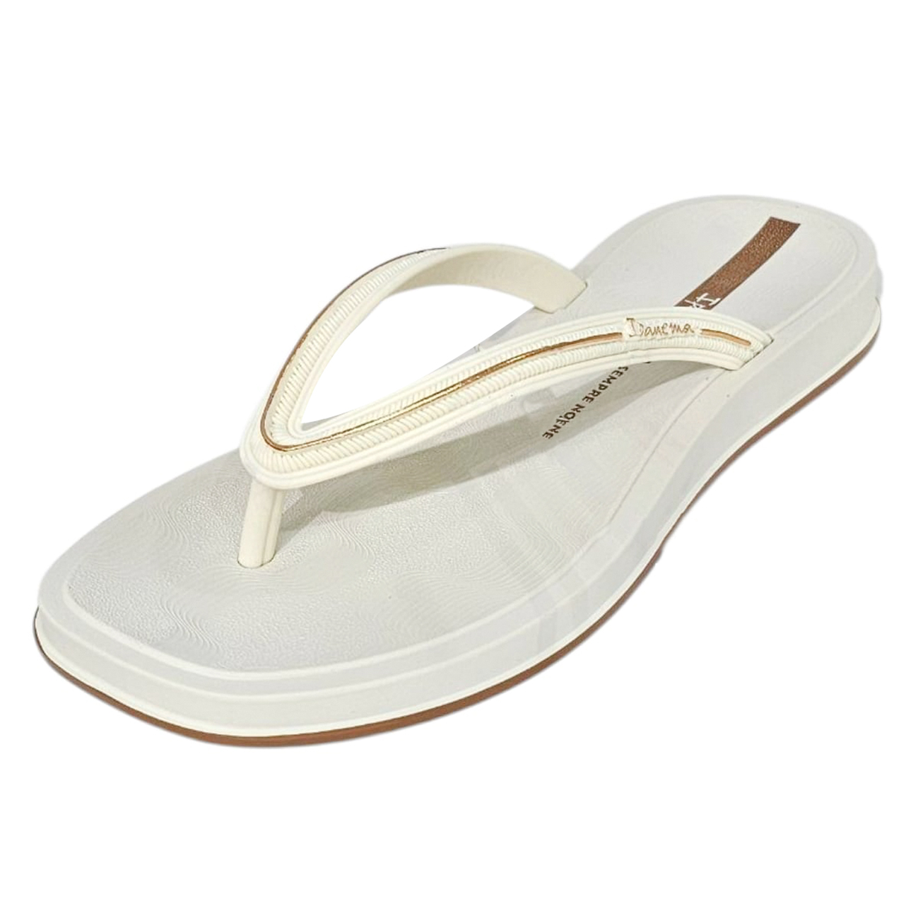 Chinelo Ipanema de dedo com detalhe metalizado em toda a tira. Tem solado plataforma baixo com detalhe bicolor.