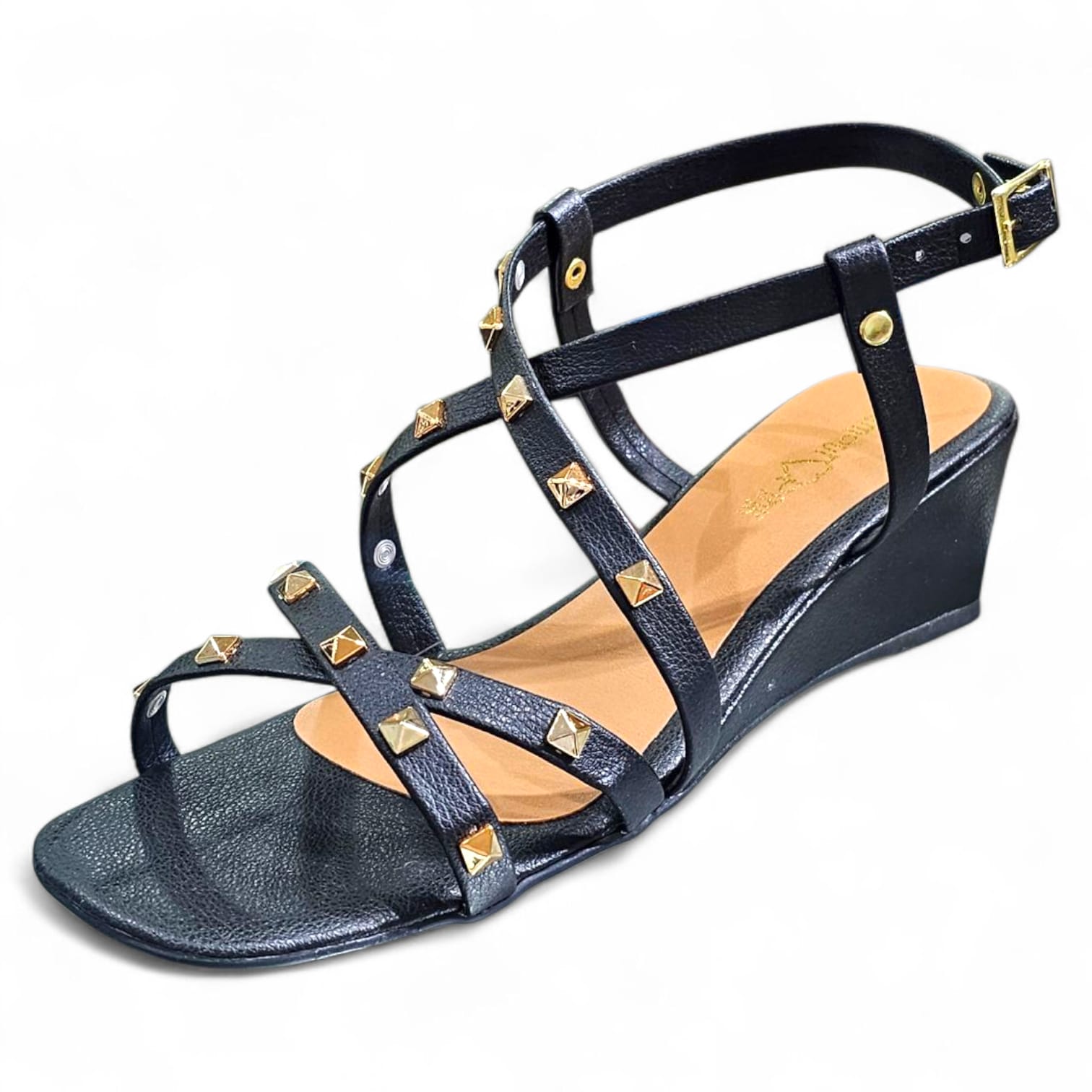Sandália clássica, elegante e confortável com tiras frontais cruzadas com aplicação de Spikes dourados para você compor looks incríveis.