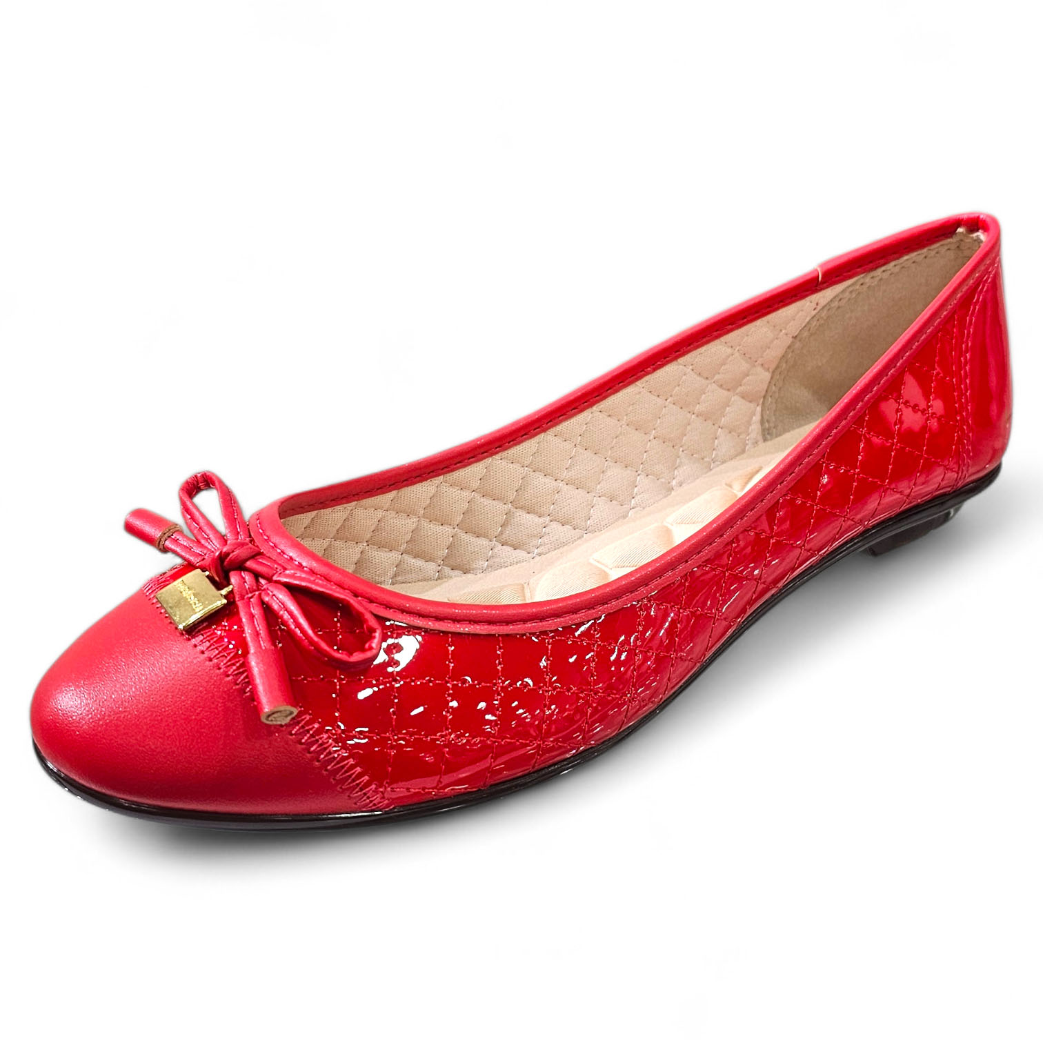 Sapatilha Captoe em Verniz com bico redondo que dá muito charme ao seu estilo. Tem o seu corpo construído com detalhes em pesponto matelassê e bico em verniz com aplicação de laço.
