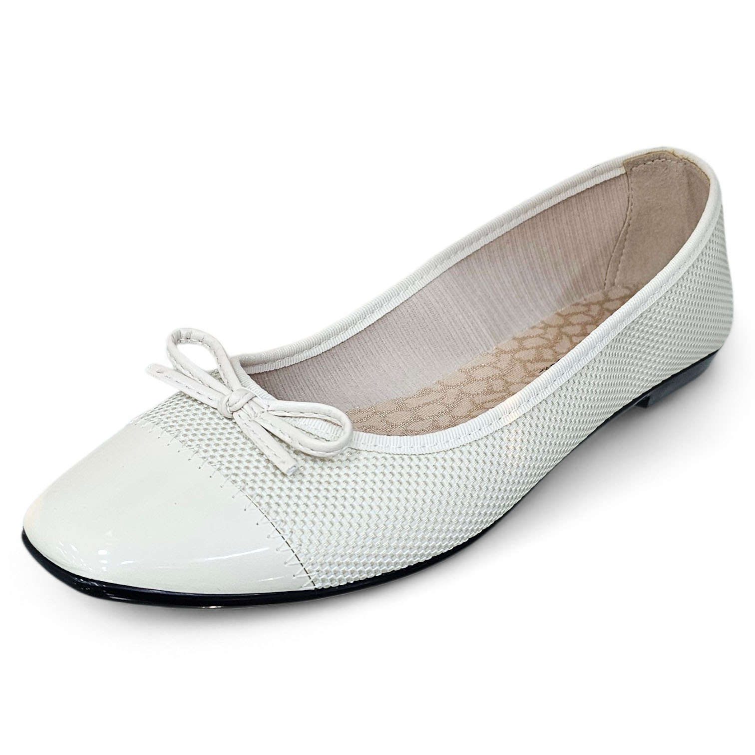 Sapatilha captoe com bico quadrado que dá muito charme ao seu estilo. Tem o seu corpo construído com detalhes em palhinha e bico em verniz com aplicação de laço.