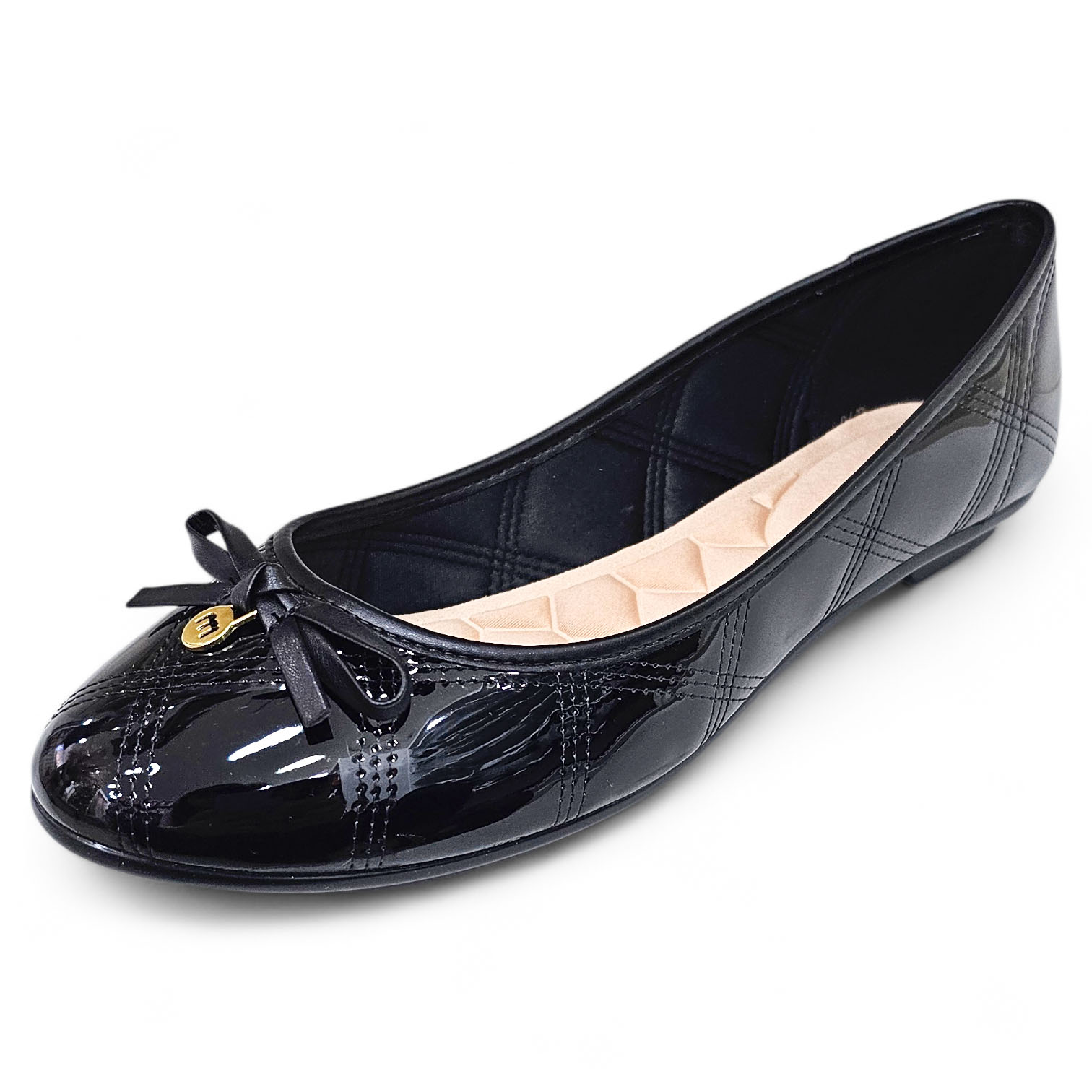 Sapatilha em Verniz com bico redondo que dá muito charme ao seu estilo. Tem o seu corpo construído com detalhes em pesponto matelassê e bico em verniz com aplicação de laço.