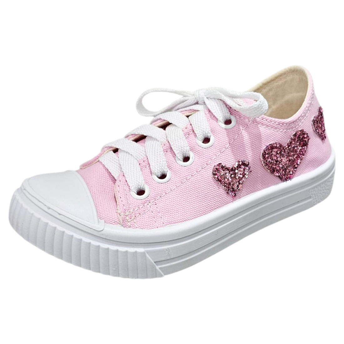 Tênis Casual cano baixo confeccionado em tecido macio e resistente, com detalhe de corações com glitter na lateral.